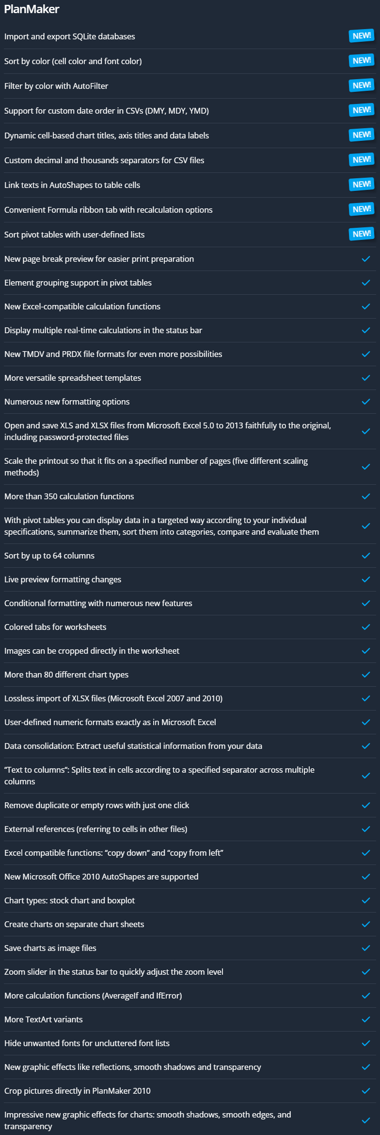 มีเครื่องมือตรวจทานการใส่สูตร (Formula Validation) ทำให้แก้ปัญหาในตารางคำนวณได้อย่างรวดเร็ว และด้วยสูตรการคำนวณที่มีให้ใช้งานเกินกว่า 350 รูปแบบ รวมถึงความสามารถในการรองรับการทำงานกับตารางขนาดใหญ่ที่มีจำนวนแถวเกินกว่า 1 ล้านแถว รวมถึงฟีเจอร์ Pivot Tables ทำให้รองรับการใช้งานอย่างกว้างขวาง และทำงานกับไฟล์ XLSX จากโปรแกรม Microsoft Excel ได้เป็นอย่างดี