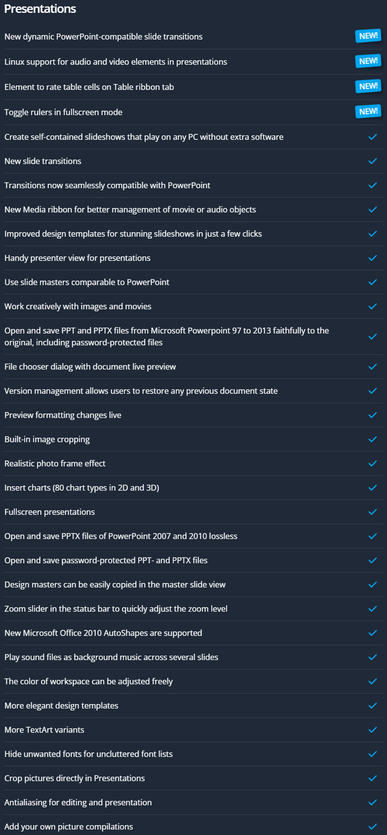 เลือกใช้เทมแพลตสำหรับงานนำเสนอสวย ๆ ที่มีจัดเตรียมไว้ให้ ทำให้ไม่ต้องยุ่งยากเสียเวลากับการออกแบบ และไฟล์งานนำเสนอ PPTX ที่สร้างขึ้นมาด้วยโปรแกรมนี้ สามารถนำไป เปิดเล่น/แก้ไข ด้วยโปรแกรม Microsoft PowerPoint ได้เป็นอย่างดี รวมถึงรองรับการบันทึกสไลด์งานนำเสนอในรูปแบบ HTML หรือในรูปแบบคลิปวิดีโอได้ด้วย