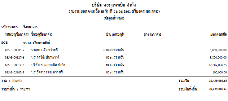 • รายงาน เงินคงเหลือในแต่ละบัญชี / แต่ละธนาคาร