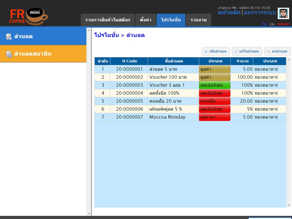 โปรแกรมจัดการร้านกาแฟ ใช้งานง่าย FR Coffee Mini ช่วยให้เจ้าของกิจการสามารถควบคุมกระบวนการขาย การใช้งานวัตถุดิบภายในร้าน ทำให้เพิ่มยอดขายได้รวดเร็ว โดยโปรแกรมได้ทำการตั้งค่ารายการไว้ให้เรียบร้อยแล้ว พร้อมใช้งานทันที เพิ่มความปลอดภัยด้วยระบบบัญชีส่วนตัวป้องกันการสับสนระหว่างการใช้งาน โดยคุณสามารถเปลี่ยนแปลง รายการ ราคา และรูปภาพสินค้าได้เอง มีการแสดงผลรายงานที่เป็นประโยชน์ และเข้าใจง่าย ช่วยควบคุมต้นทุน และสร้างผลกำไรด้วยโปรโมชัน รวมถึงการให้ส่วนลดพร้อมระบบสมาชิก จัดการกิจการร้านกาแฟในฝันของคุณอย่างมืออาชีพ