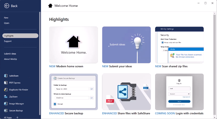 ด้วยหน้าจอ Home Screen ของ โปรแกรมบีบอัดไฟล์ WinZip 28 ช่วยให้เข้าถึงฟีเจอร์การใช้งานของโปรแกรมที่มากกว่าแค่การบีบอัดไฟล์ได้อย่างง่ายดาย เข้าถึงคู่มือและความรู้ในการใช้งานโปรแกรม รายละเอียดการอัปเดตโปรแกรม ทำให้ใช้ประโยชน์ได้อย่างเต็มความสามารถ