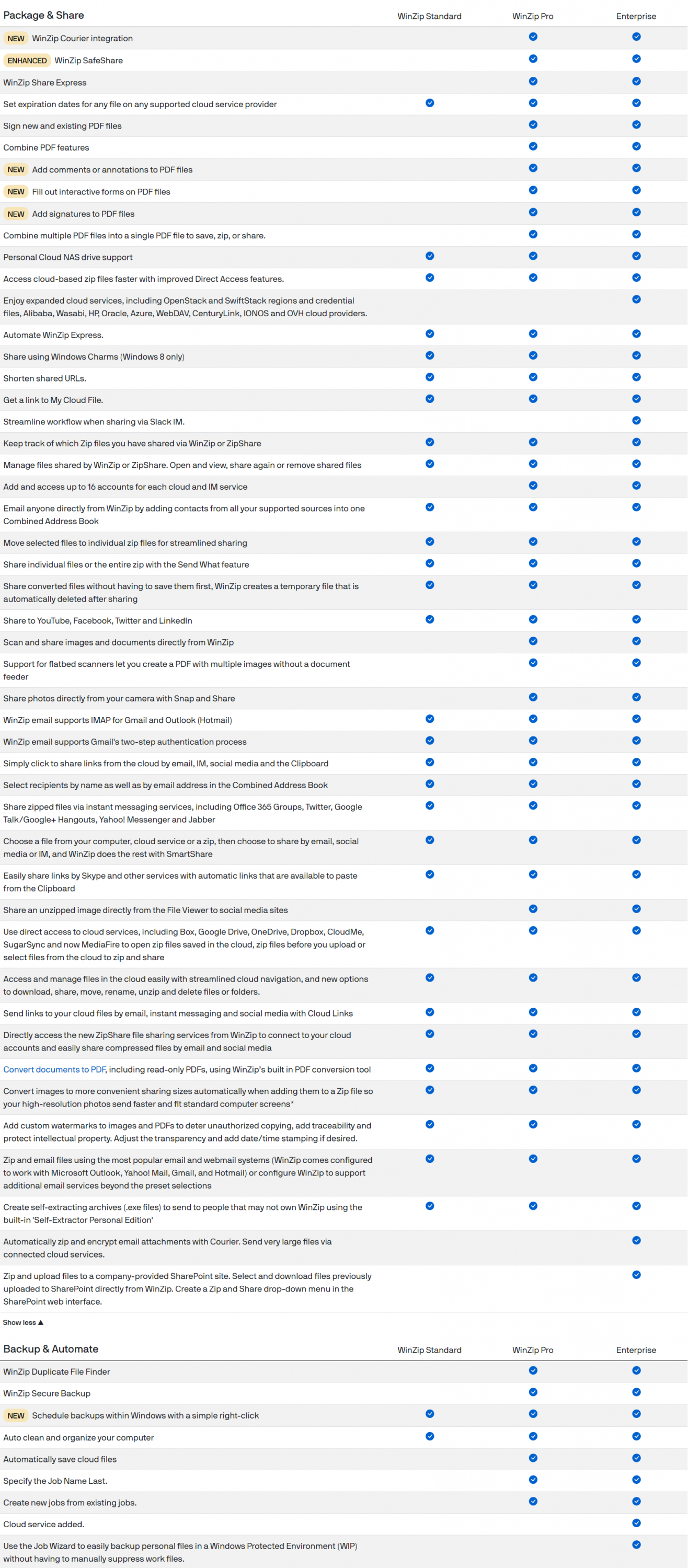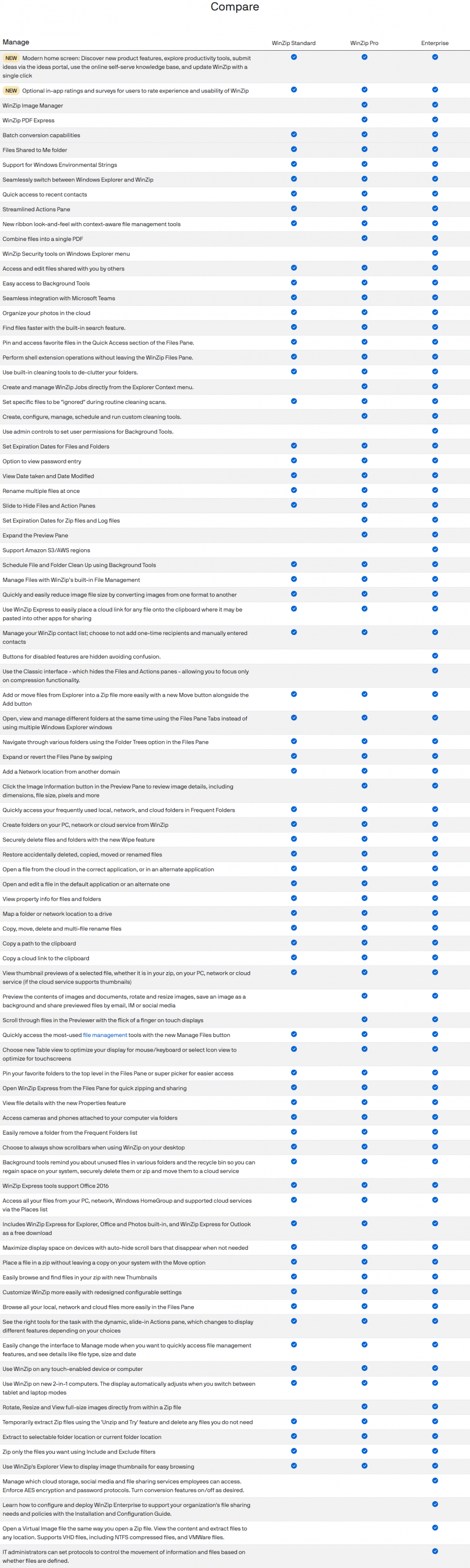 โปรแกรมบีบอัดไฟล์ WinZip 28 นั้นมีให้เลือกทั้งรุ่น Standard ที่มีความสามารถระดับพื้นฐาน และรุ่น Pro ที่มีความสามารถขั้นสูง ซึ่งคุณสามารถเลือกได้ตามความต้องการ ดังนี้