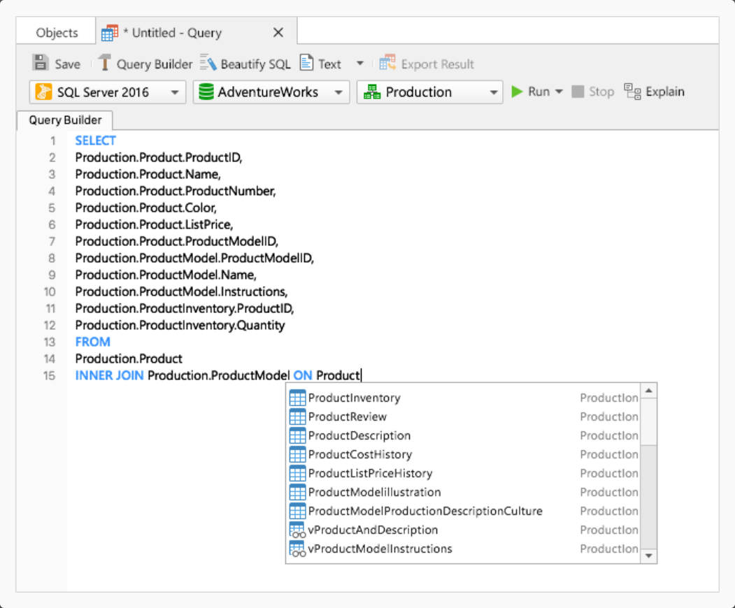 ด้วยเครื่องมือ SQL/Query Builder ที่มีอยู่ใน โปรแกรมจัดการฐานข้อมูล รุ่นพรีเมียม Navicat Premium 17 - Perpetual License ช่วยให้เราสามารถ สร้าง แก้ไข และรันคำสั่ง SQL โดยไม่ต้องกังวลเกี่ยวกับรูปแบบคำสั่งที่ใช้ เพียงแค่เลือกจัดการส่วนต่าง ๆ โปรแกรมจะเขียนคำสั่ง SQL ให้เราทันที และสร้างคำสั่ง SQL ได้อย่างรวดเร็ว ด้วยการเลือกจาก Drop-down List