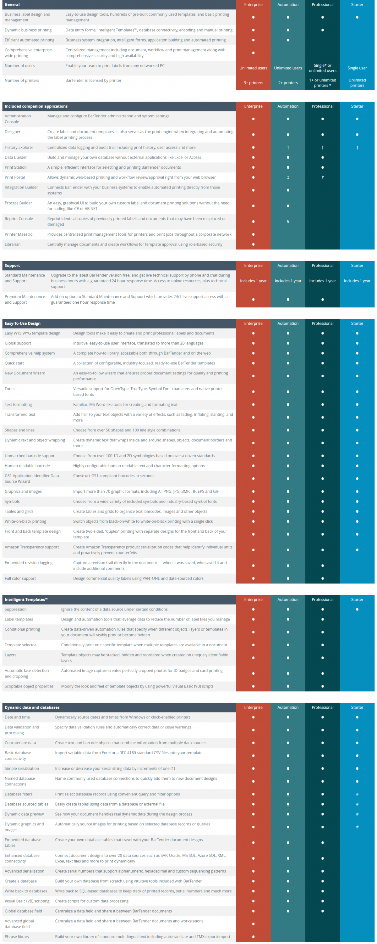 ตารางเปรียบเทียบ โปรแกรมพิมพ์ฉลาก บาร์โค้ด BarTender ในแต่ละเวอร์ชัน