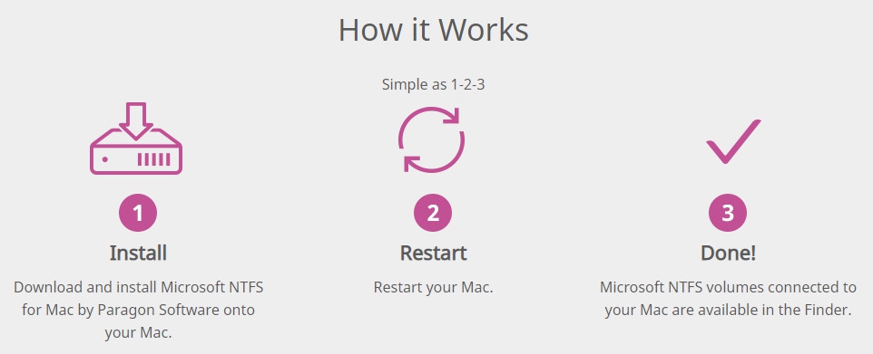 ใช้งานง่ายเหมือนนับ 1-2-3 โดยขั้นแรกให้เราทำการติดตั้ง โปรแกรมทำพาร์ทิชัน NTFS ให้ใช้ได้บนเครื่องแมค รุ่นสำหรับใช้งานตามบ้าน Microsoft NTFS for Mac by Paragon Software ลงในเครื่อง จากนั้น Restart เครื่อง เมื่อเริ่มระบบใหม่ เราก็จะสามารถเข้าถึงไดรฟ์แบบ NTFS ที่เชื่อมต่ออยู่กับเครื่อง Mac ได้ผ่านทาง Finder