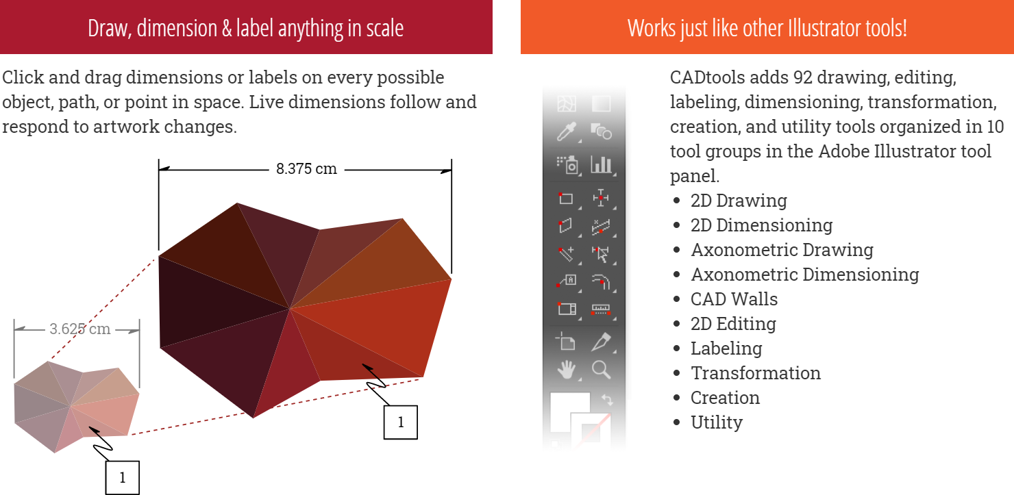 โปรแกรมปลั๊กอิน Illustrator สำหรับงานเขียนแบบ ลิขสิทธิ์ซื้อขาด CADtools 14 - Perpetual License จะช่วยให้งานเขียนแบบด้วย โปรแกรม Adobe Illustrator เป็นเรื่องที่ง่ายและเร็วขึ้น สามารถคลิกที่วัตถุใด ๆ แล้วลากเมาส์เพื่อขยายขนาดของวัตถุนั้น โดยที่ตัวเลขบอกขนาดของวัตถุนั้น (Dimension) จะมีการขยายตามสเกลที่เพิ่มขึ้น และสามารถแปะฉลาก (Label) ลงบนวัตถุใด ๆ ได้ตามต้องการ