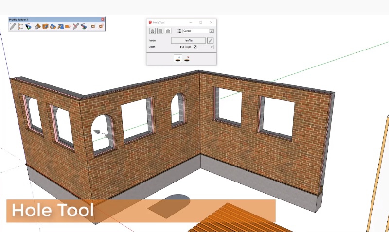 ในส่วนเสริม Profile Builder มีเครื่องมือที่ช่วยอำนวยความสะดวกในการเจาะช่องบนกำแพงเพื่อใส่หน้าต่าง หรืิอบานกระจกให้กับอาคารได้อย่างง่ายดาย ซึ่งมีรูปทรงของการเจาะช่องให้เลือก และสามารถกำหนดขนาดความกว้าง ความสูงของบานหน้าต่างๆ ได้ตามต้องการ นอกจากนี้ยังเหมาะที่จะใช้กับการเจาะรูบนเหล็กที่เป็นโครงสร้างของอาคารอีกด้วย