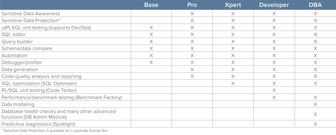 โปรแกรมจัดการฐานข้อมูล รุ่นพื้นฐาน มาพร้อมฟังก์ชันที่ช่วยประหยัดเวลาในการเขียนโค้ดด้วยภาษา PL/SQL มาพร้อมฟีเจอร์มากมายสำหรับนักพัฒนา และผู้ดูแลฐานข้อมูล (DBA) ประกอบไปด้วย เครื่องมือ Debug สำหรับภาษา PL/SQL และ SQL*Plus และยังมาพร้อม utPLSQL Unit Testing เพื่อทดสอบโค้ดได้ตามต้องการ