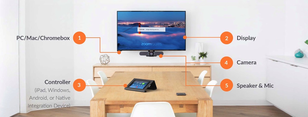 ต้องการอุปกรณ์เพียงไม่กี่ชิ้น หรือใช้อุปกรณ์ที่มีอยู่เพื่อใช้งานโซลูชันการประชุมทางไกลด้วย Zoom Rooms ได้อย่างง่ายดาย ต้องการแค่เพียง จอภาพ , เครื่องคอมพิวเตอร์ (PC/Mac/Chromebox) , อุปกรณ์ Controller (ซึ่งอาจจะเป็นเครื่อง iPad หรืิอแท็บเล็ตบนระบบ Android , Windows หรืออุปกรณ์ควบคุมแบบเฉพาะของ Zoom Rooms) และสิ่งสุดท้ายที่ต้องการคือ อุปกรณ์ กล้อง ลำโพง และไมค์ ซึ่งสามารถนำอุปกรณ์โทรศัพท์ IP หรืออุปกรณ์ห้องประชุมตามมาตรฐาน H.323 จากทั้งแบรนด์ Polycom , Cisco หรือ Lifesize ที่มีอยู่เดิม มาใช้งานกับ Zoom Rooms ได้เลย