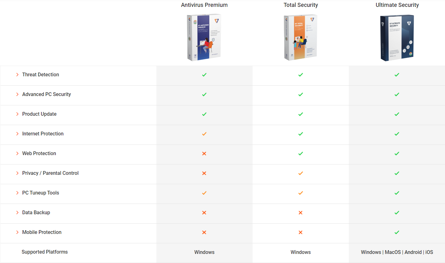 ตารางเปรียบเทียบ โปรแกรมแอนตี้ไวรัส K7 ในแต่ละเวอร์ชัน
