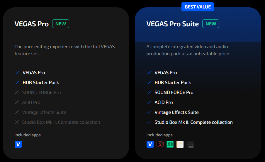 โปรแกรมตัดต่อวิดีโอ VEGAS ที่จำหน่ายใน Thaiware Shop นั้นมีวางจำหน่ายอยู่ทั้งหมด 5 เวอร์ชันหลัก ๆ ด้วยกันคือ