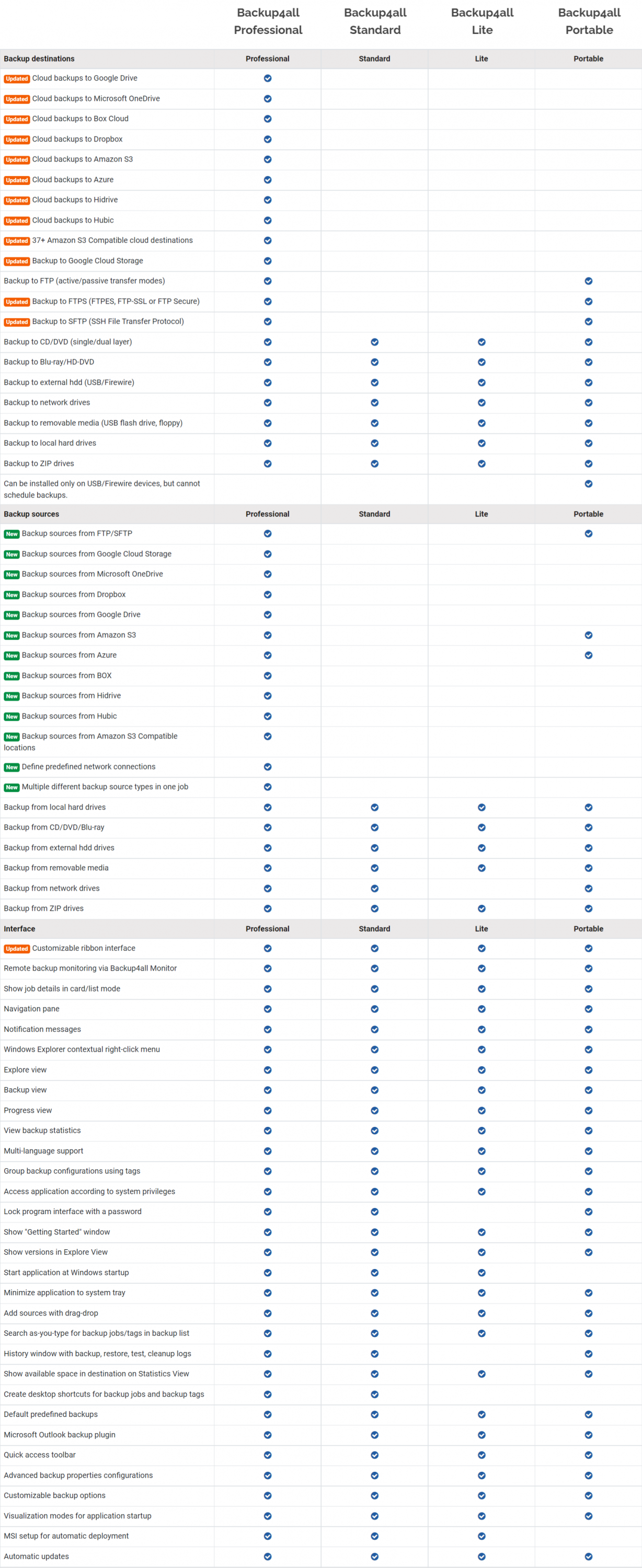 ตารางเปรียบเทียบ โปรแกรมสำรองข้อมูล Backup4all ในแต่ละเวอร์ชัน