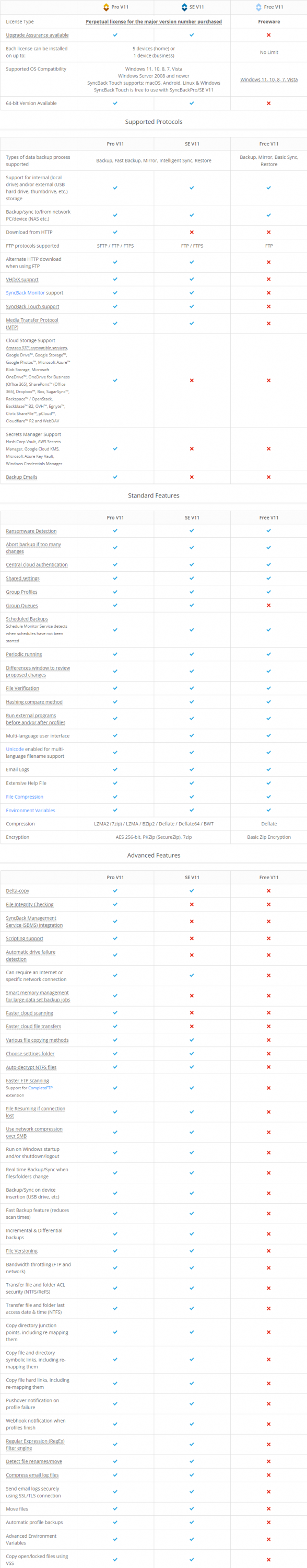 ตารางเปรียบเทียบ โปรแกรมสำรองข้อมูล SyncBack ในแต่ละเวอร์ชัน