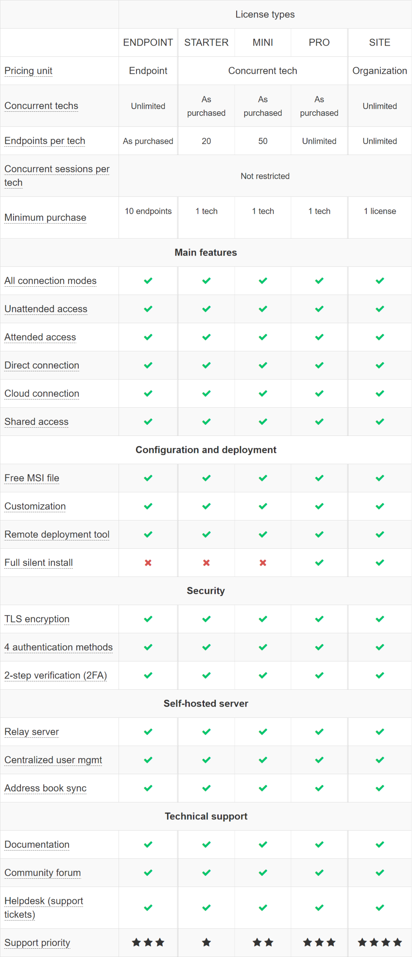 นอกจากนี้แล้วเจ้าหน้าที่ IT Support ยังจะสามารถทำการเชื่อมต่อระยะไกลเข้ากับเครื่อง คอมพิวเตอร์/เซิร์ฟเวอร์ ได้แบบไม่จำกัดจำนวนเครื่องในช่วงระยะเวลาเดียวกัน และฟีเจอร์พิเศษที่เพิ่มเข้ามาคือ Full Silent Install สามารถติดตั้งโปรแกรม Host ลงในเครื่องคอมพิวเตอร์ที่จะต้องมีการเข้าถึงจากระยะไกล ได้แบบที่ไม่รบกวนผู้ใช้งาน