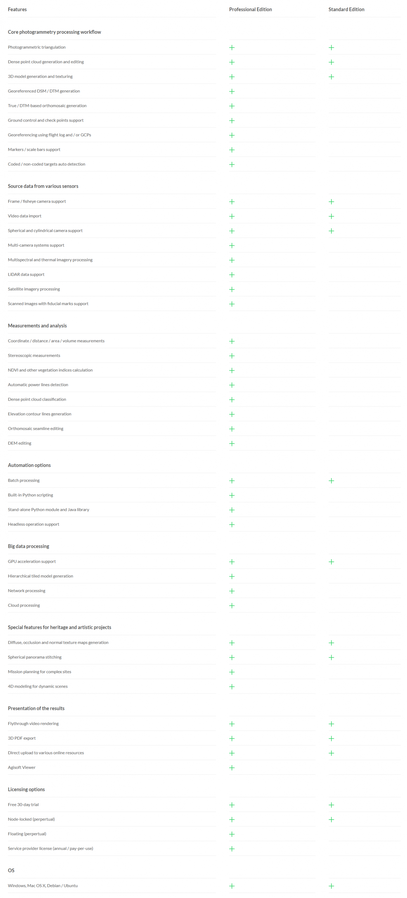 ตารางเปรียบเทียบความสามารถ โปรแกรมสร้างโมเดล 3 มิติจากภาพถ่าย และทำภาพถ่ายทางอากาศ Agisoft Metashape ในแต่ละเวอร์ชัน