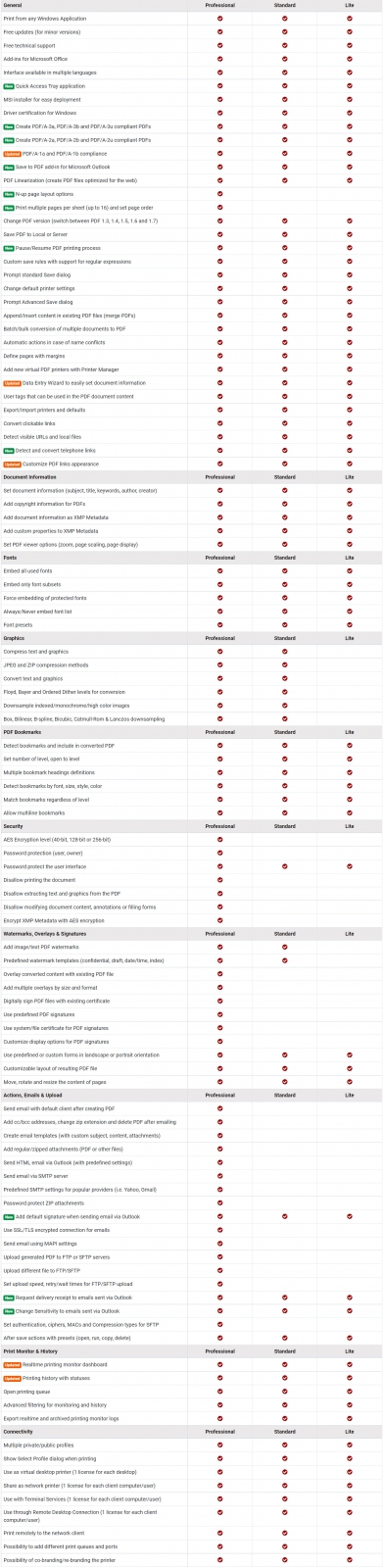 ตารางเปรียบเทียบ โปรแกรมสร้าง PDF จากไฟล์เอกสาร novaPDF ในแต่ละเวอร์ชัน