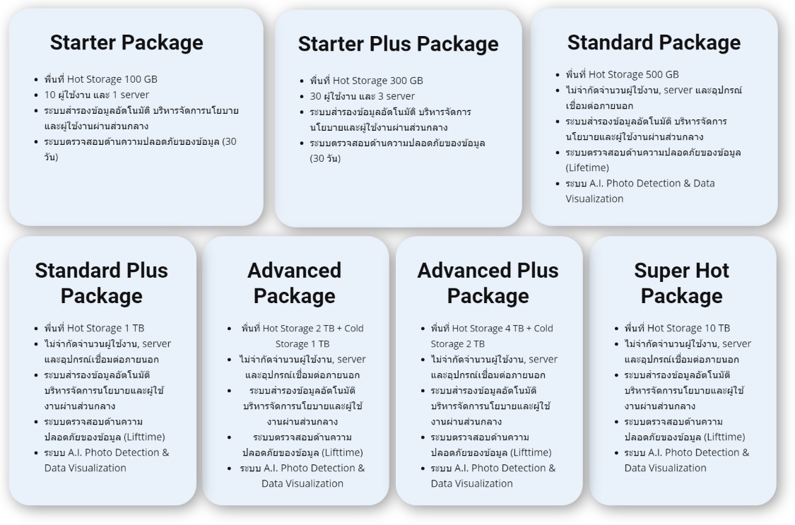 หากต้องการปรับแต่งขนาดพื้นที่เก็บข้อมูล, ประเภทของ Storage, ฟีเจอร์พื้นฐาน, ฟีเจอร์ขั้นสูงเพิ่มเติม (อาทิ eDiscovery, OCR, Media Streaming) หรือต้องการสำรองข้อมูลบน Mobile, SQL, Workstation & Server Disaster Recovery หรือ Office 365 Business สามารถติดต่อเจ้าหน้าที่ฝ่ายขาย