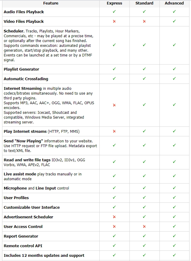 ตารางเปรียบเทียบ โปรแกรมจัดรายการวิทยุ ดีเจออนไลน์ RadioBOSS ในแต่ละเวอร์ชัน