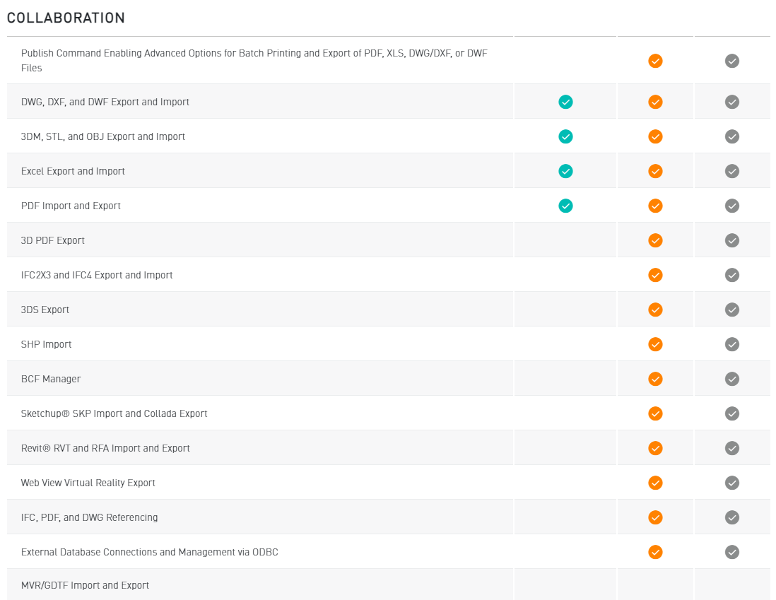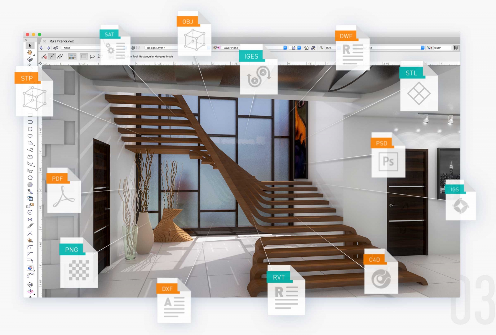 โปรแกรมออกแบบ เขียนแบบ รุ่นมาตรฐาน Vectorworks Fundamentals ทำให้นักออกแบบ สามารถทำงานร่วมกับทีมงานที่ใช้โปรแกรมตัวอื่นๆ ในงานออกแบบได้เป็นอย่างดี ด้วยเครื่องมือการนำเข้า (Import) และ ส่งออก (Export) ไฟล์งานออกแบบร่วมกับโปรแกรมตัวอื่นๆ รวมถึงมีความสามารถในการทำงานร่วมกับฟอร์แมตไฟล์งานออกแบบต่างๆ ได้เป็นอย่างดี อาทิ