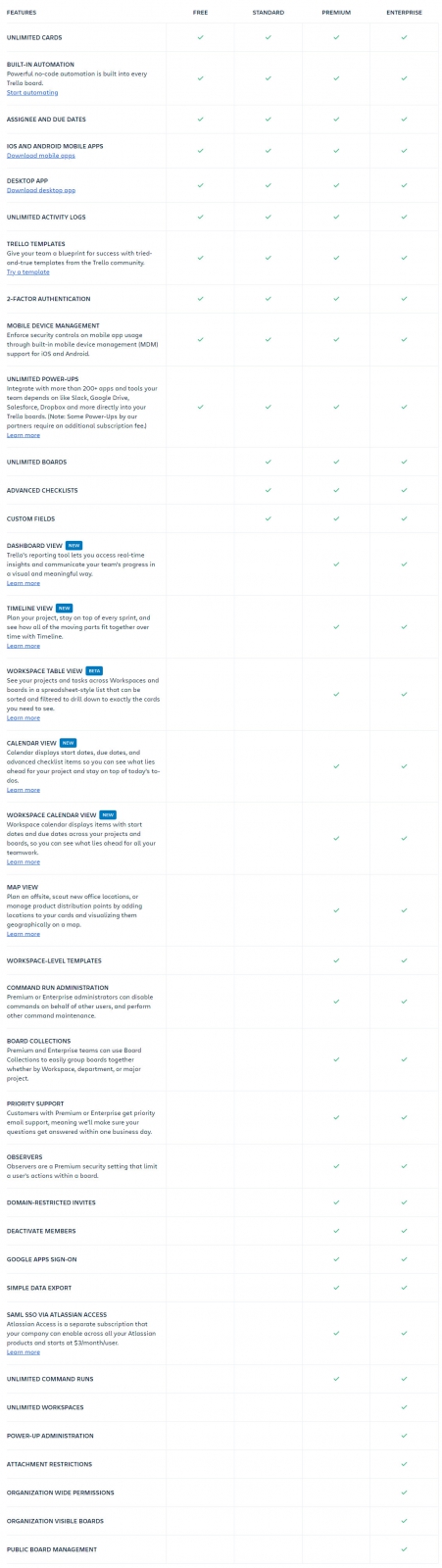 ตารางเปรียบเทียบ โปรแกรม Trello ในแต่ละเวอร์ชัน