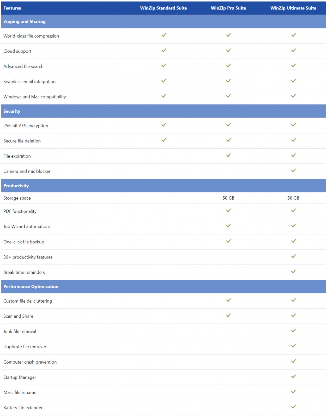 ตารางเปรียบเทียบ ชุดโปรแกรมบีบอัดไฟล์ และแชร์ไฟล์ WinZip Suite ในแต่ละเวอร์ชัน