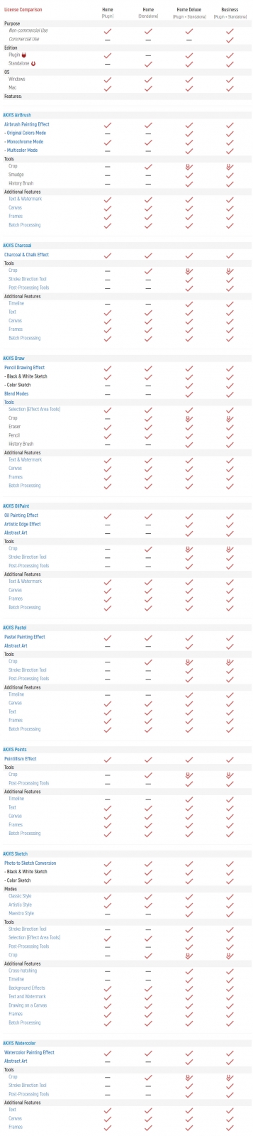 ตารางเปรียบเทียบ ชุดโปรแกรมปลั๊กอิน โปรแกรมแต่งรูป AKVIS Artistic Bundle ในแต่ละเวอร์ชัน
