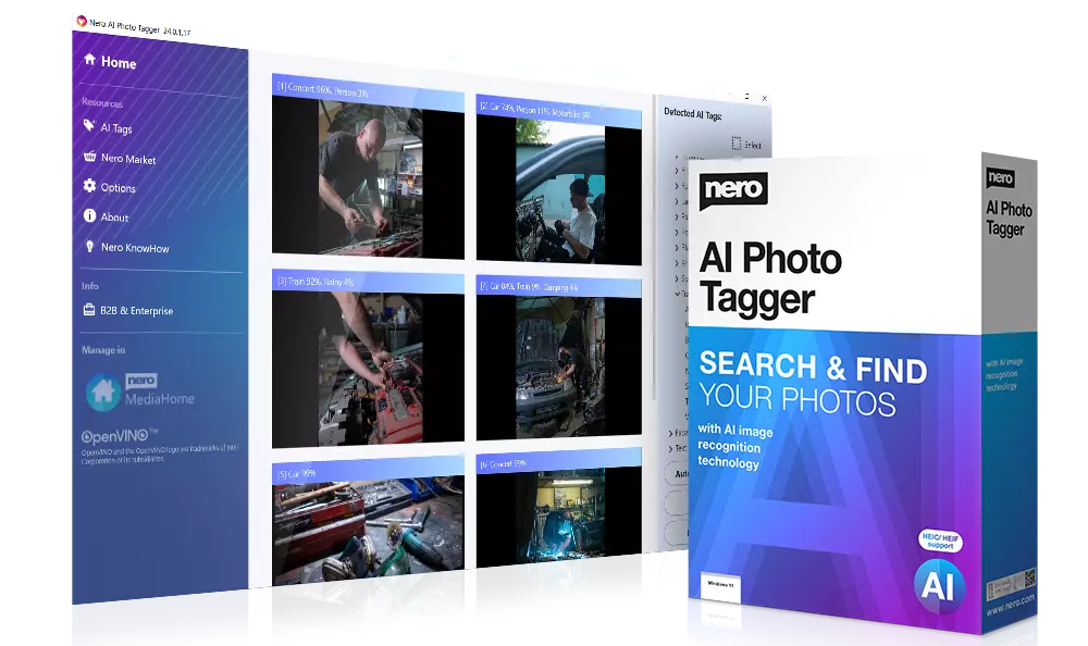 โปรแกรมจัดระเบียบรูปภาพ Nero AI Photo Tagger 2025 นั้นจะช่วยจัดลำดับคลังรูปภาพของคุณด้วยเทคโนโลยี ปัญญาประดิษฐ์ (AI) โดยมันมีความสามารถในการแบ่งรูปภาพออกเป็นหมวดหมู่ได้อย่างแม่นยำ ด้วยเทคโนโลยี Intel OpenVINO ที่รองรับ 10th Generation Intel Core Processors สามารถจัดเรียง และจัดระเบียบรูปถ่ายเป็นหมวดหมู่ได้มากกว่า 100 หมวดหมู่