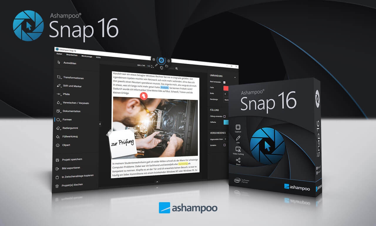 โปรแกรมจับภาพหน้าจอ อัดวิดีโอหน้าจอ Ashampoo Snap มาพร้อมความสามารถในการจับภาพหน้าจอ และ อัดวิดีโอหน้าจอพร้อมบันทึกเสียง ได้อย่างยืดหยุ่น และง่ายดาย นอกจากนี้ยังแต่งรูปได้อีกด้วย เหมาะสำหรับการใช้งานเพื่อทำสื่อการสอน พรีเซนเทชั่น หรือแคสเกม ได้อย่างมืออาชีพ