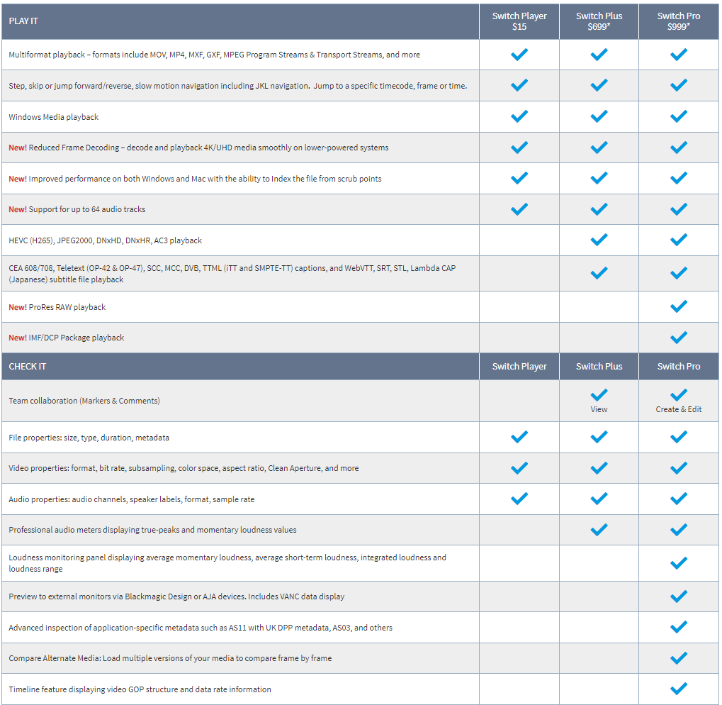 ตารางเปรียบเทียบ โปรแกรมตรวจสอบคุณภาพไฟล์วิดีโอ Telestream Switch ในแต่ละเวอร์ชัน
