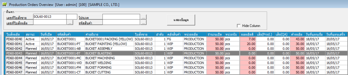 หน้าจอในการติดตามแผนงานระบบผลิตของ โปรแกรมจัดการอุตสาหกรรมการผลิตไทย SFC BOX Shopfloor Control โดยตัวอย่างตามภาพด้านบนจะเป็นการติดตามข้อมูลต่อเลขที่ใบสั่งขาย (Sale order) ว่าถึงที่ขั้นตอนไหนแล้ว โดยได้ทำการเปิดใบสั่งผลิตไปแล้ว 8 ใบสั่งผลิต เพราะเราได้แตกเลขที่ใบสั่งผลิตต่อขั้นตอน หรือ