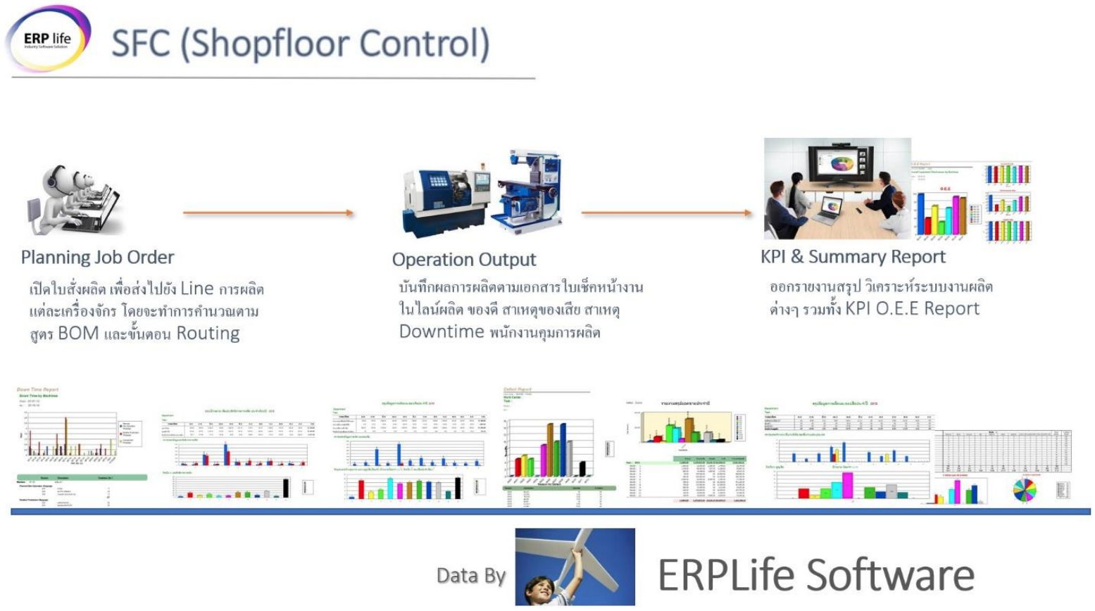 โปรแกรมจัดการอุตสาหกรรมการผลิตไทย SFC BOX Shopfloor Control รองรับการสรุปและออกรายงาน Summary Report และ KPI Report ต่าง ๆ ที่เกี่ยวข้องกับกระบวนการของอุตสาหกรรมการผลิตได้ครบถ้วน อาทิ
