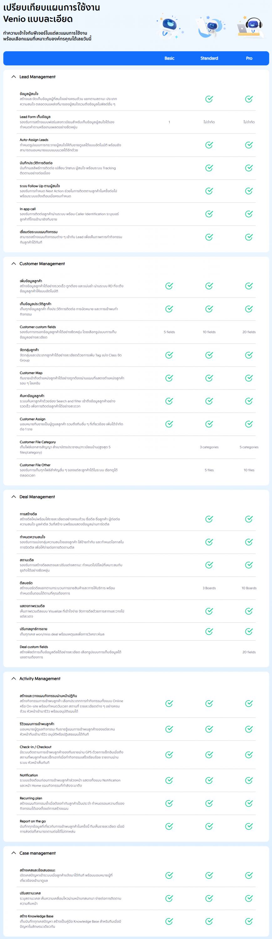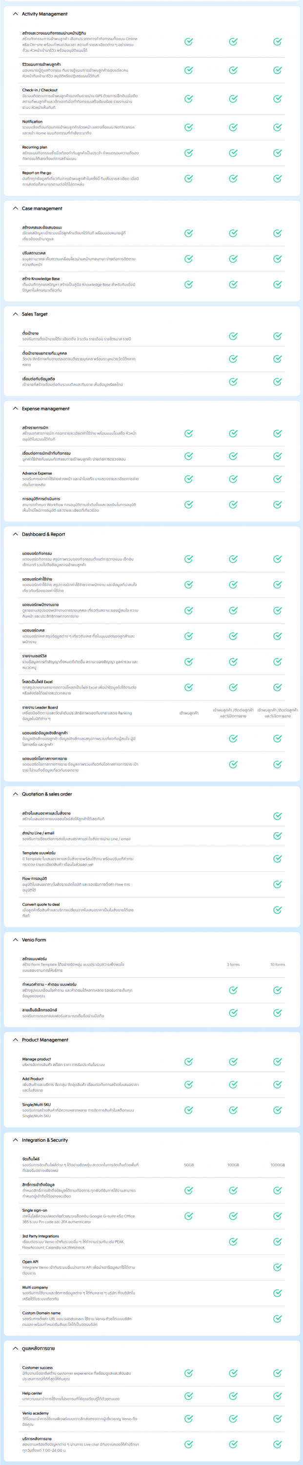 ตารางเปรียบเทียบความสามารถ โปรแกรมระบบริหารงานขายอย่างมืออาชีพ Venio Sales CRM แต่ละเวอร์ชัน