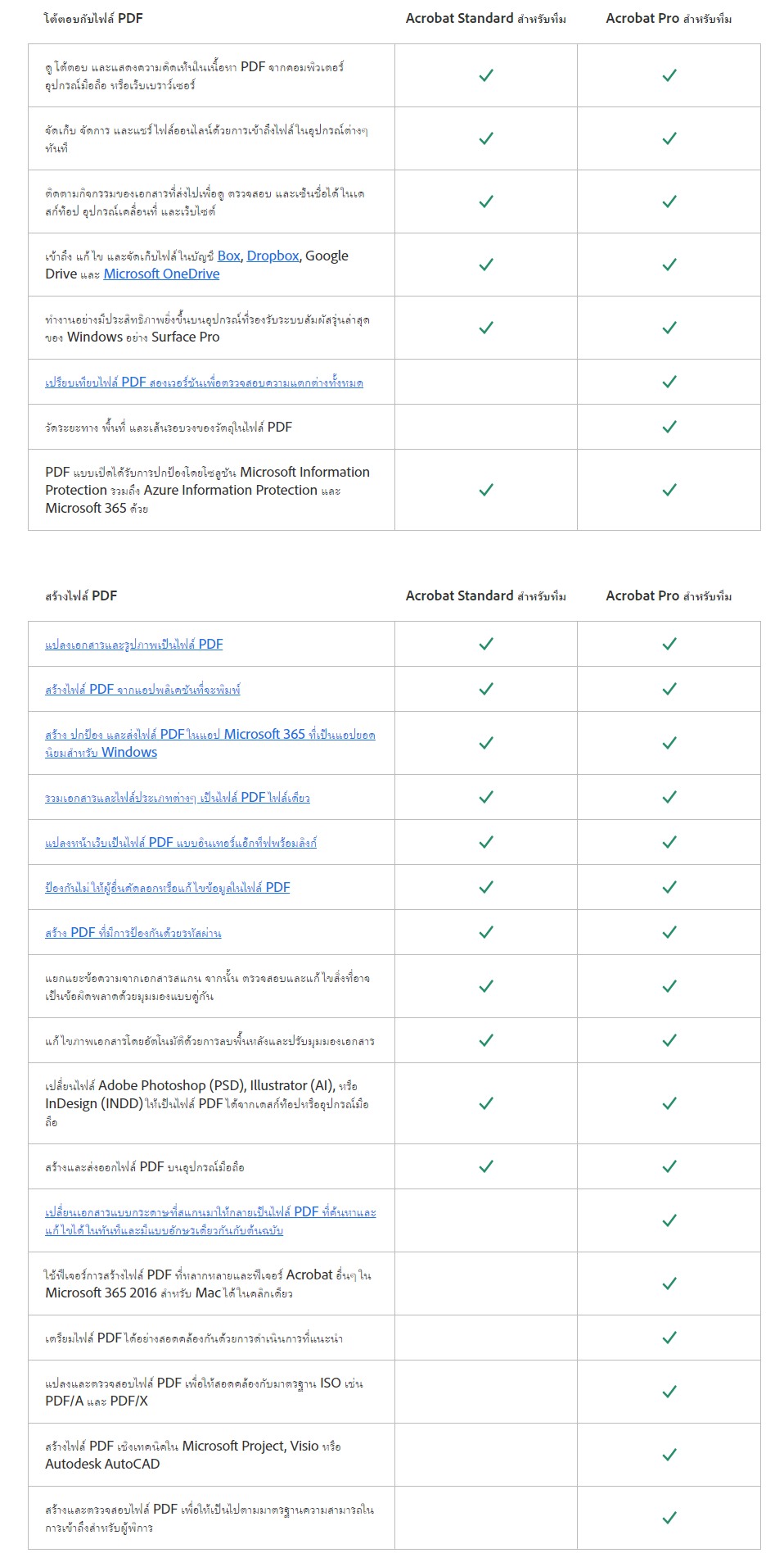 ตารางเปรียบเทียบความสามารถ โปรแกรมจัดการเอกสาร Adobe Acrobat แต่ละรุ่น