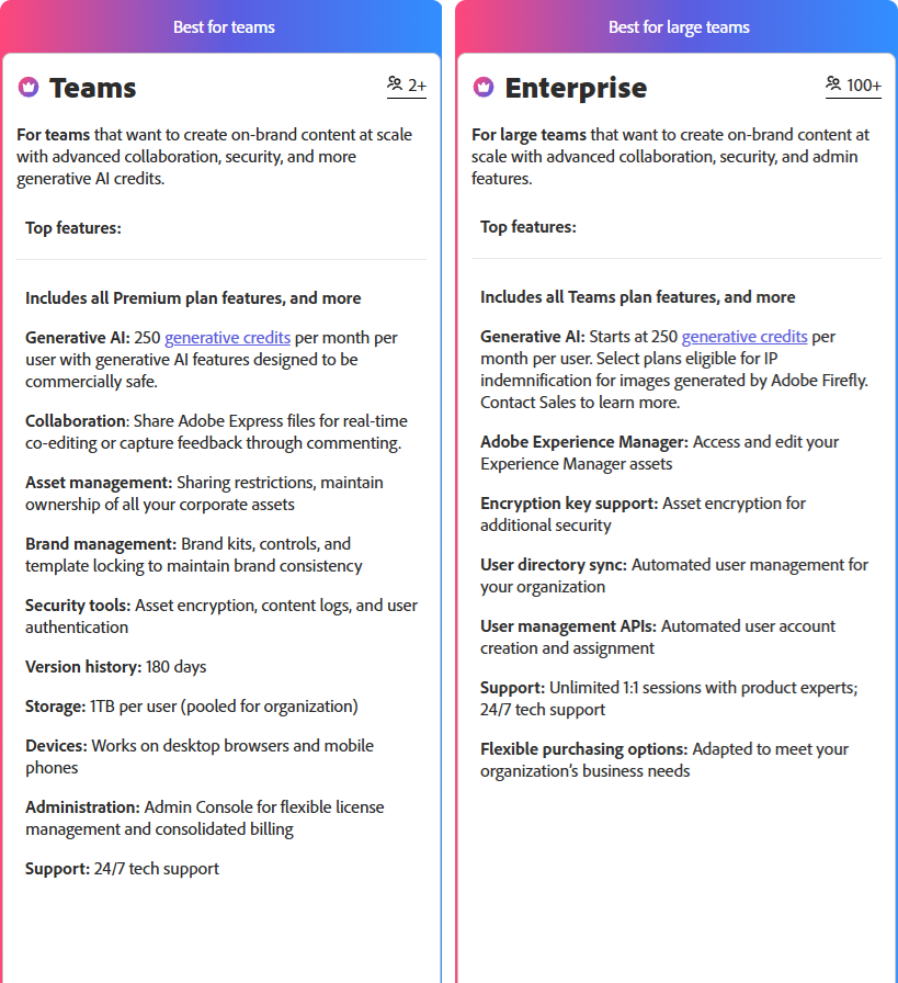 โปรแกรมสร้างสื่อกราฟิกทุกรูปแบบได้อย่างง่ายดาย รุ่นสำหรับทีมงานขนาดใหญ่ในธุรกิจ มาพร้อมกับฟีเจอร์ของรุ่น Adobe Express for Teams Corporate ครบถ้วน โดยฟีเจอร์ที่เพิ่มมาในรุ่น Enterprise Corporate ก็มี อาทิ