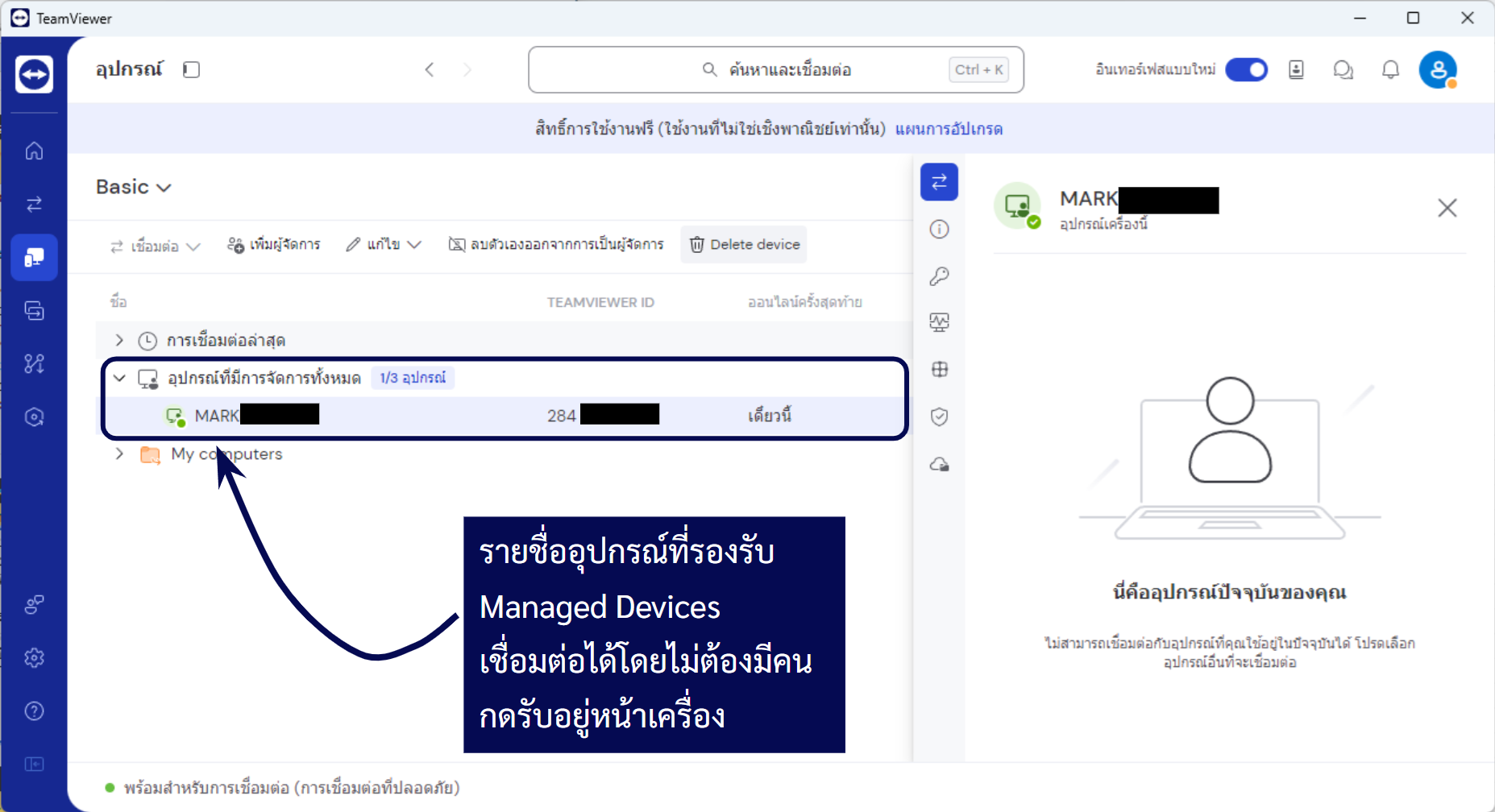 และเมื่อกำหนดการเชื่อมต่อแบบ Managed Devices เรียบร้อยแล้ว ก็จะเห็นรายชื่อของอุปกรณ์ ปรากฏอยู่ในส่วน "อุปกรณ์ที่มีการจัดการทั้งหมด"